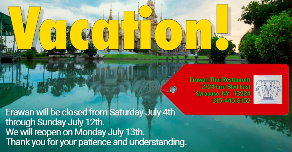 Erawan will be closed for vacation from Saturday July 4th through Sunday July 12th. We will reopen on Monday July 13th. We appreciate your patience and understanding.